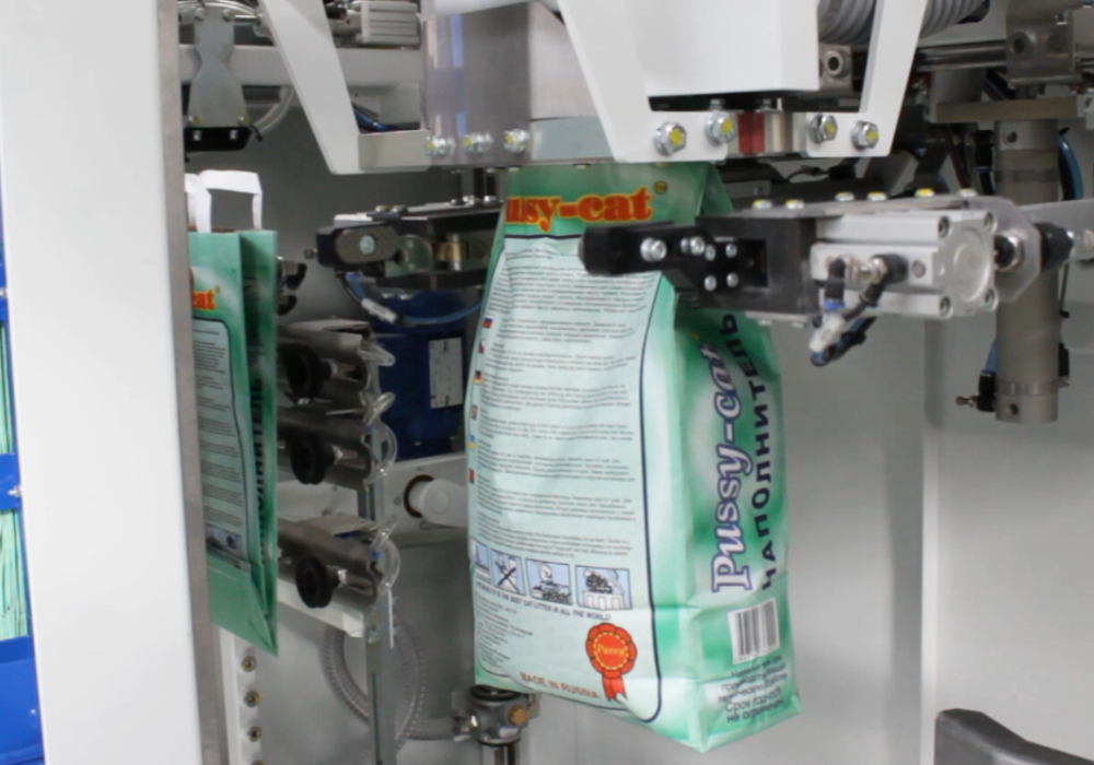 Bags are transported directly from the magazine to the filling spout using the bag transport system. After filling and compacting, the bag is transported to the sealing station.