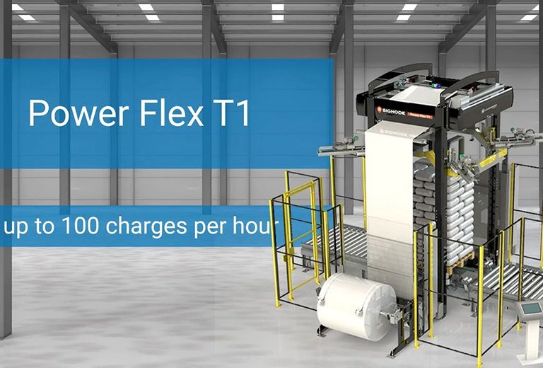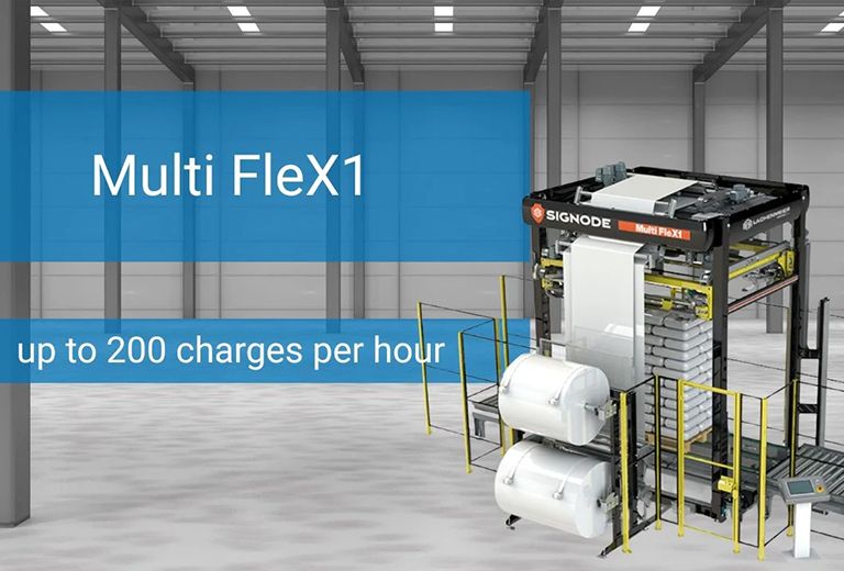 High-performance palletizer for efficient and precise palletizing of bags with five-sided layer compaction, no bag overlap Bag feed: High infeed Capacity up to 2,200 bags/hour