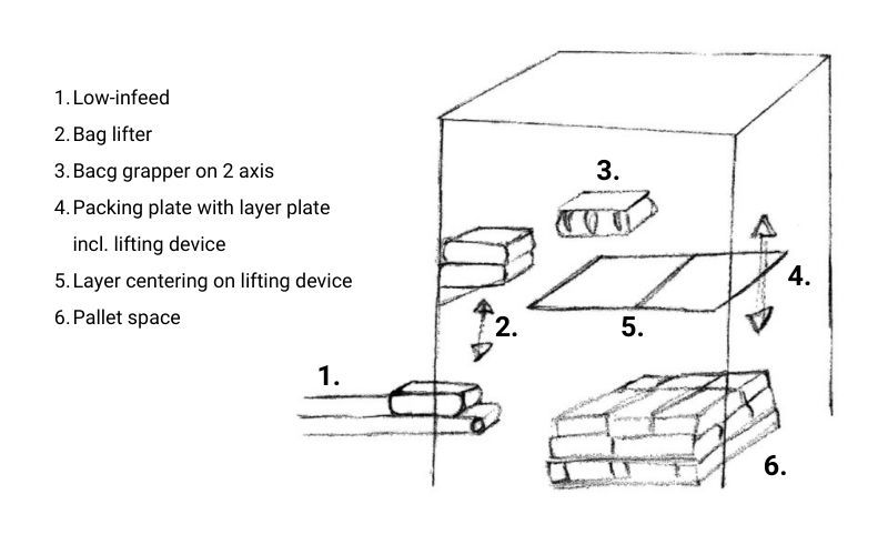 The bag initially runs in at a low level and is lifted precisely to the desired layer level by a bag lifter. The bag gripper and packing plate with centering device are mounted on a lifting device and move up exactly to the palletizing dimension. The pallet stands stably on the roller conveyor, ready for safe, even palletizing.