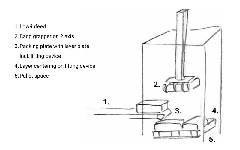 The bag arrives at a low level and is placed by a 3-axis bag gripper at the appropriate layer level of the pallet. The pallet to be palletized stands on the roller conveyor or flush with the floor.