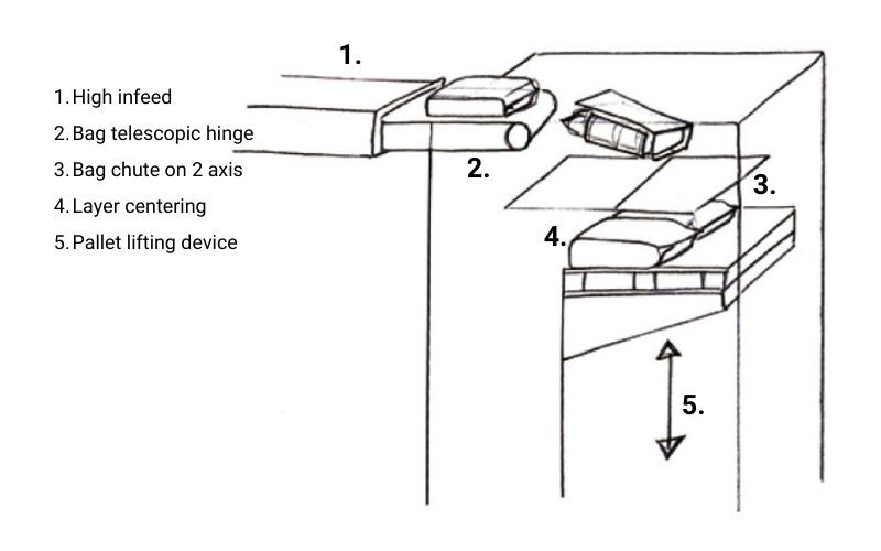 The bag runs in at a high level and is turned into a bag chute by a telescopic conveyor belt. The bag chute places the bag on the packing tray with centering device at the upper level. The pallet to be palletized stands on the roller conveyor with hydraulic lifting device.