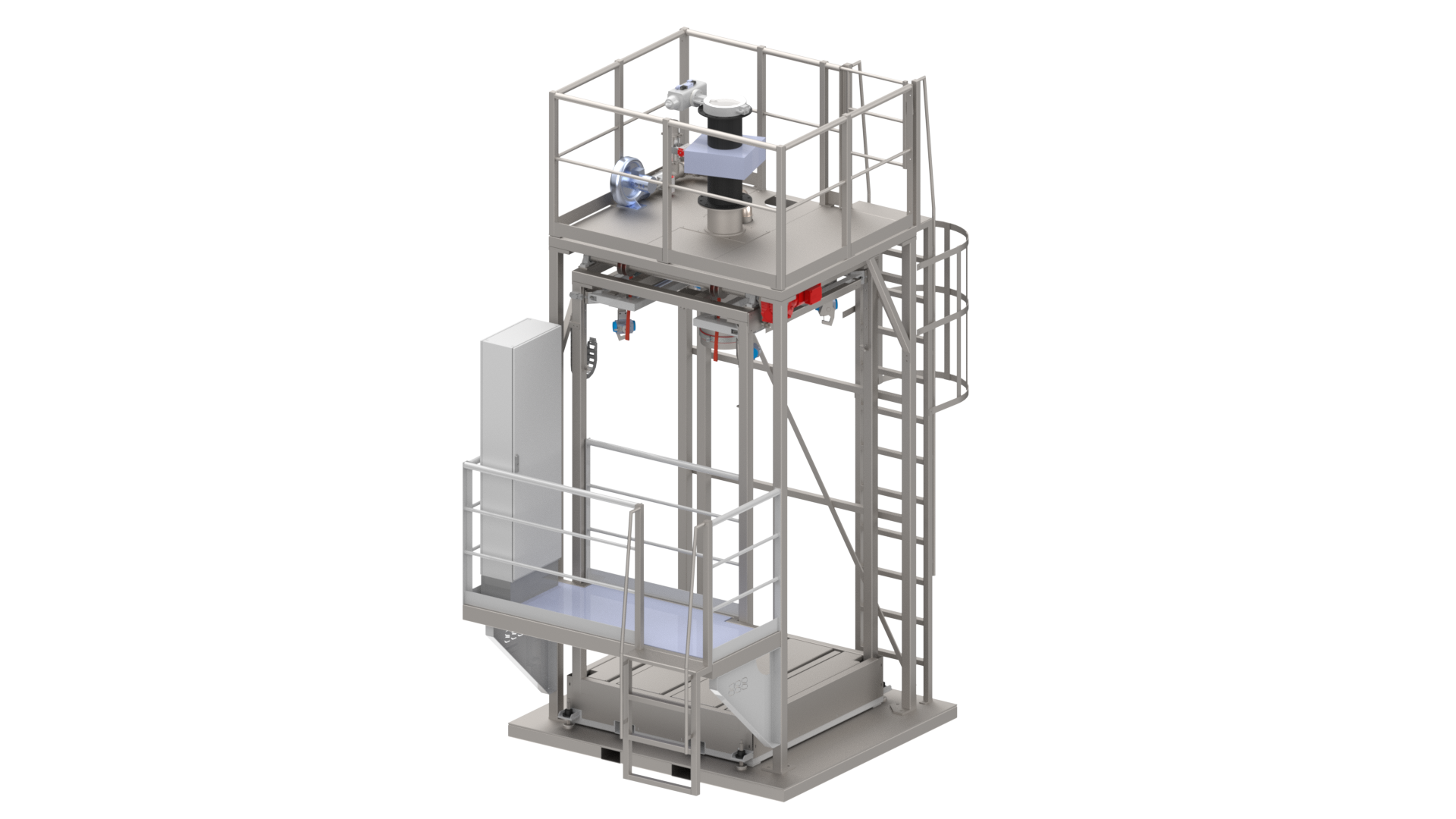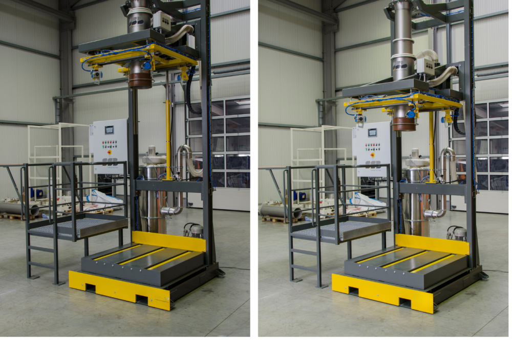 Von der Bedienerplattform, die seitlich oder vor der Maschine angebracht werden kann, lässt sich der Sack optimal in die Lasthaken einhängen und anschließen. Die hinteren Lasthaken werden zum Anhängen des Big-Bag automatisch nach vorne gefahren, um dem Bediener das Einhängen zu vereinfachen. Die Haken öffnen sich automatisch nach der Befüllung oder nach dem Rüttelzyklus. Die Position der Haken kann für unterschiedliche Sackquerschnitte verstellt werden.