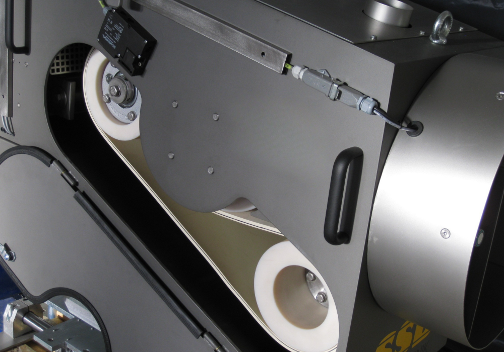 Der Fördergurt ist eine Spezialkonstruktion, geeignet für die hohen Umlaufgeschwindigkeiten. Um den Gurt zu wechseln, muss kein Maschinenteil demontiert werden. Soll der Gurt neu aufgelegt werden, muss die Gurtspannung lediglich gelöst werden. Danach lässt sich der Gurt sehr einfach wechseln.