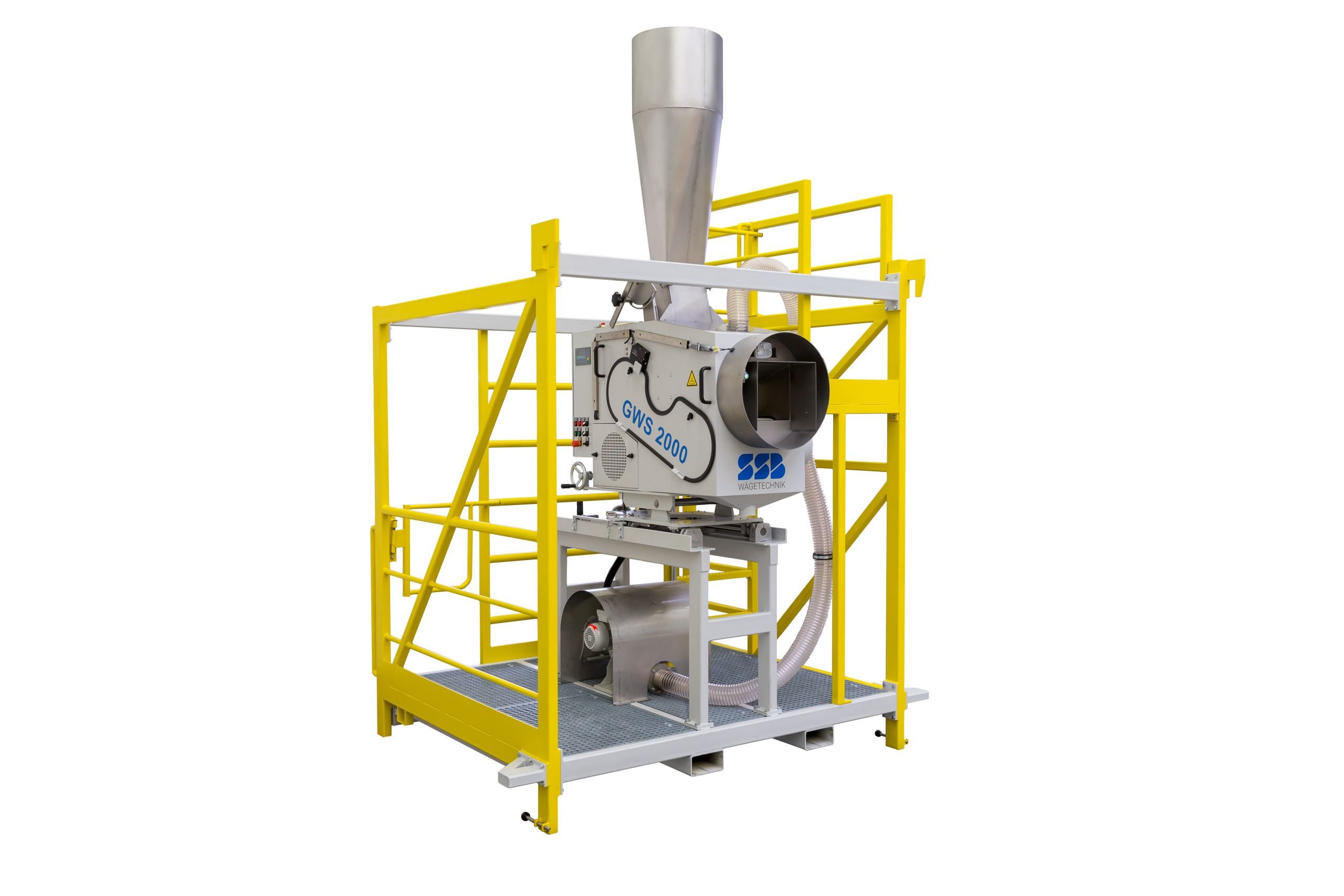 Der Granulatwerfer ist auf einer stabilen Tragkonstruktion montiert, die je nach Modell direkt an den Container herangefahren oder angehängt wird. Zwei integrierte Plattformen bieten dem Bedienpersonal sicheren Zugang und beste Übersicht.