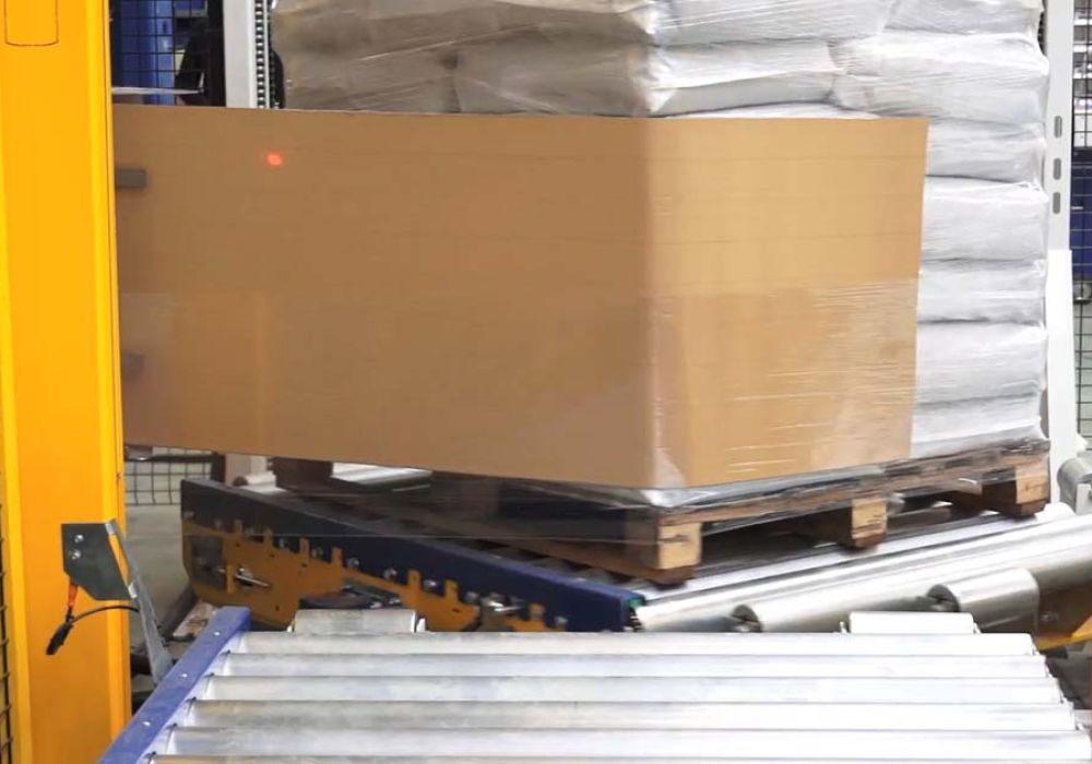 Die Paletten können zum zusätzlichen Schutz mit einem Karton umreift werden. Hierbei wird ein Karton zusammen mit der Stretch Folie um die Palette gezogen. Diese Funktion ist optional erhältlich und wird in den Stretch Wickler integriert.
