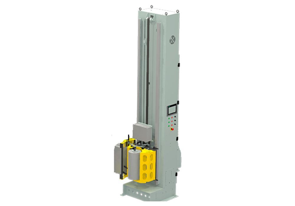 Die Säule mit integriertem Schaltschrank trägt das Abrollsystem. Das Bedienpanel ist rückseitig installiert und kann somit außerhalb des Sicherheitsbereichs bedient werden. Die Positionierung der Säule in Bezug auf den Drehtisch ist flexibel positionierbar und reduziert den Platzbedarf um den Drehtisch.