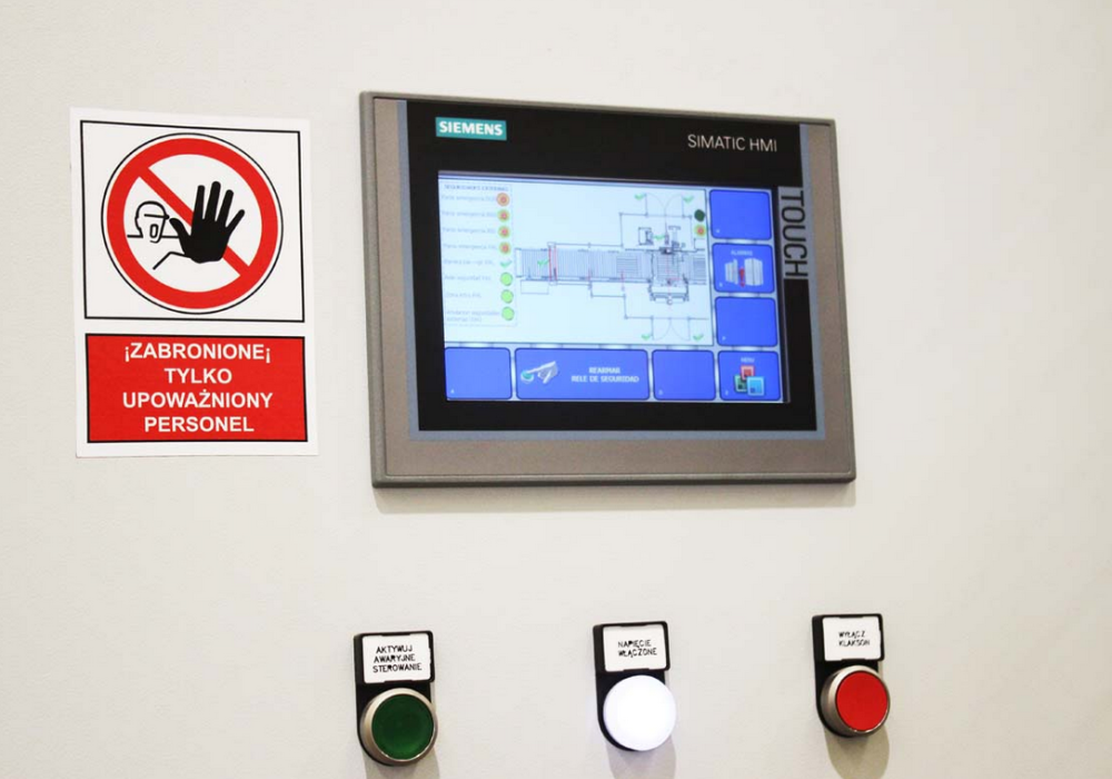 Die Maschine ist durch einen Sicherheitszaun gegen ein Eindringen in den Sicherheitsbereich geschützt. Der offene Ausgang der fertigen Paletten wird durch ein Lichtgitter mit Muting System geschützt. Die Maschine erfüllt die gültigen CE-Richtlinien und ist entsprechend gekennzeichnet.