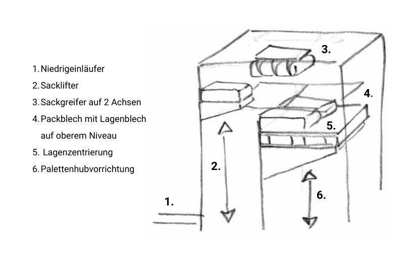 Der Sack läuft zunächst auf niedrigem Niveau ein und wird von einem Sacklifter präzise auf das gewünschte Lagenniveau gehoben. Auf dem oberen Niveau greifen Sackgreifer und Packblech mit integrierter Zentriervorrichtung die Säcke und positionieren sie exakt für die Palettierung. Die zu beladende Palette steht stabil auf der Rollenbahn, während die hydraulische Hubvorrichtung sie optimal auf die jeweilige Lage ausrichtet. So entsteht eine sichere, präzise und effiziente Stapelung jeder Schicht.