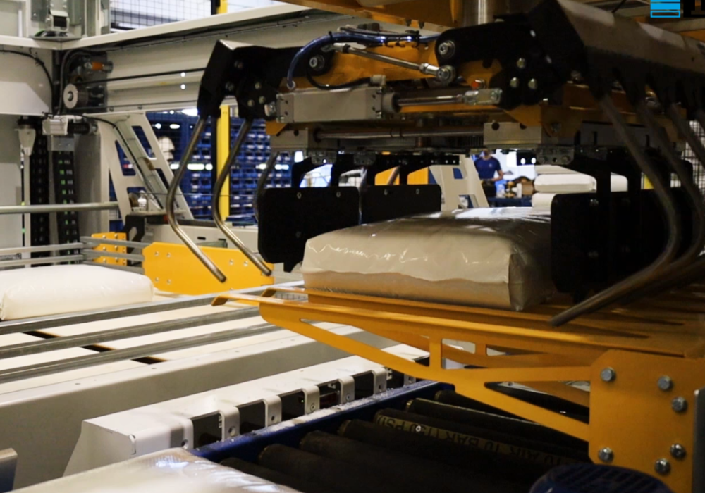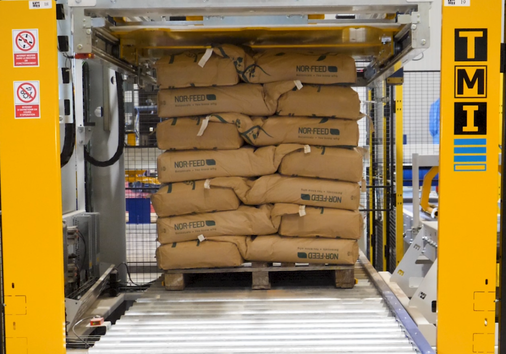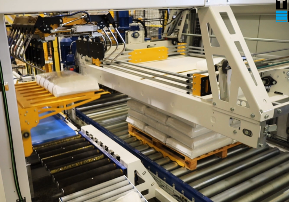 Die Hybrid-Palettierer von TMI verbinden die Präzision der Robotik mit der Effizienz kartesischer Systeme, die durch Seitenschieber unterstützt werden. Diese Kombination bietet ein hohes Maß an Effizienz beim Stapeln und Überlappen unregelmäßiger Säcke (z. B. Offensäcke). Der robotergesteuerte Top-Greifer ermöglicht das Überlappen der Säcke, gleicht deren unregelmäßige Form aus und sorgt selbst bei komplexen Konfigurationen oder anspruchsvollen Umgebungen für eine äußerst stabile Palette.