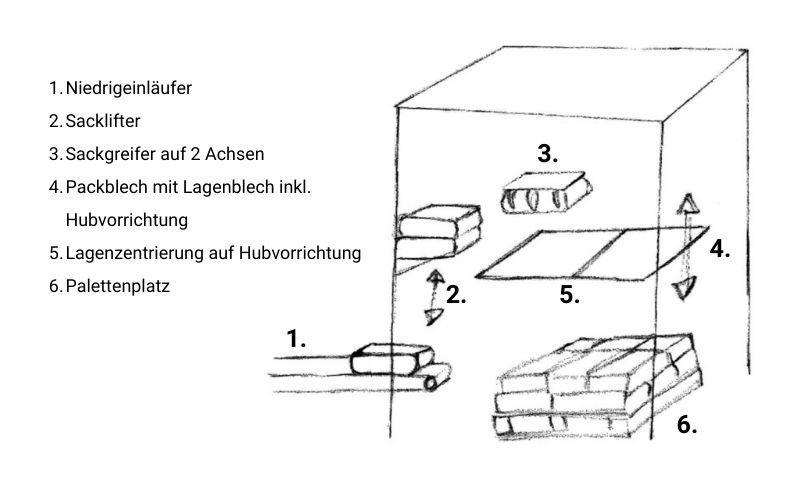 Der Sack läuft zunächst auf niedrigem Niveau ein und wird von einem Sacklifter präzise auf das gewünschte Lagenniveau gehoben. Sackgreifer und Packblech mit Zentriervorrichtung sind auf einer Hubvorrichtung montiert und fahren exakt auf das Palettiermaß hoch. Die Palette steht stabil auf der Rollenbahn, bereit für eine sichere, gleichmäßige Palettierung.