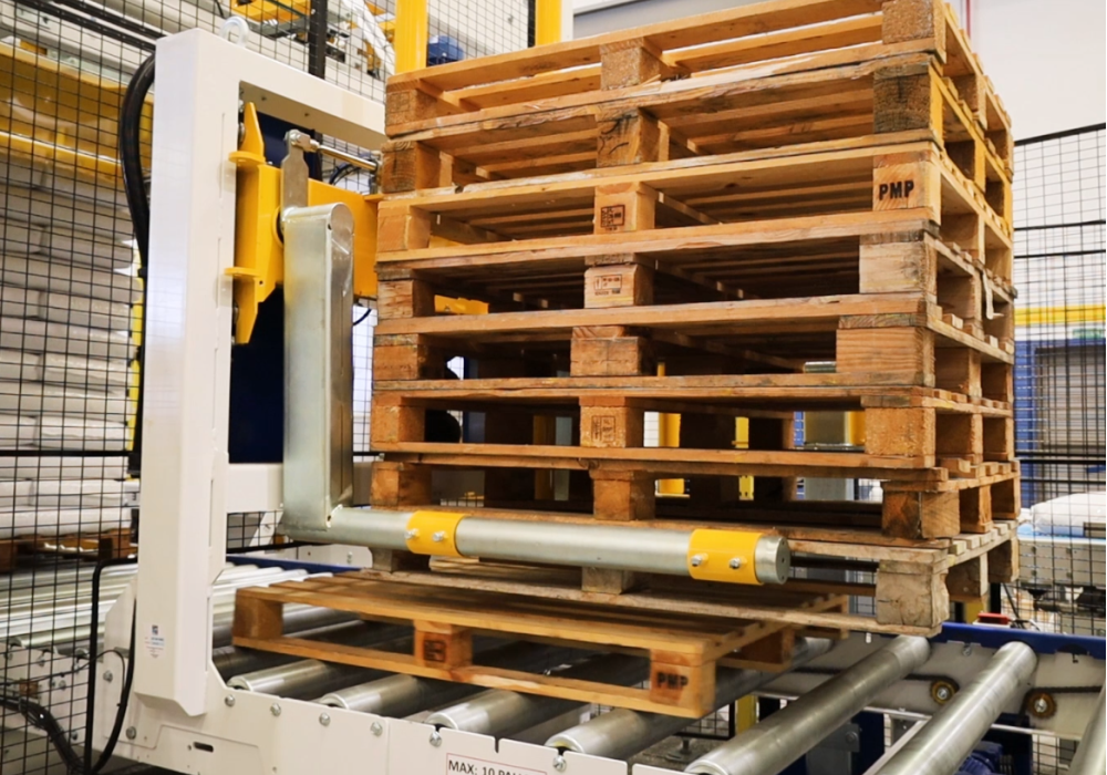 Automatischer Palettenspender mit Ein- und Auslaufrollenbahnen.