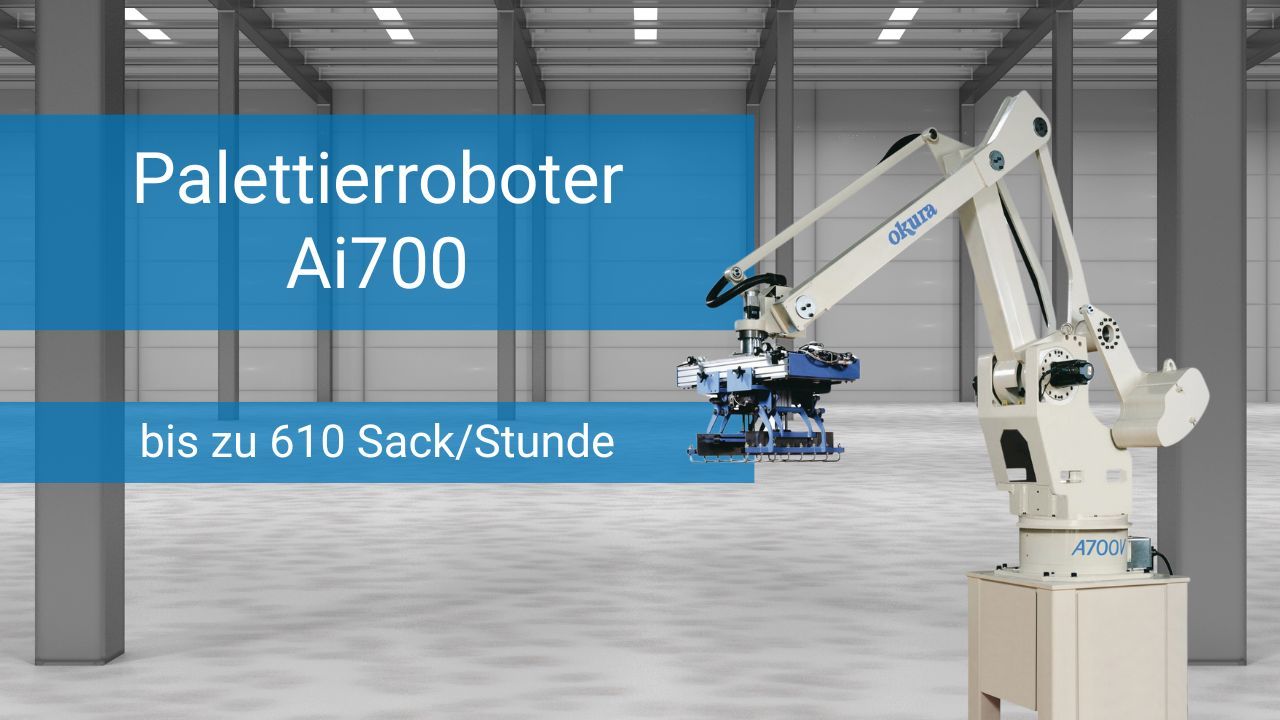 Der Okura Palettierroboter Ai700 palettiert zuverlässig und effizient Sackware, Kartons und Kanister und verpackt diese sicher und kompakt für den weiteren Transport. Den neuen Roboter von Okura gibt es in drei verschiedenen Ausführungen, die je nach Absackleistung differieren. Somit kann jeder Kunde seinen Roboter entsprechend seiner Anforderung auswählen. Die Roboter zeichnen sich vor allem durch ihre hohe Zuverlässigkeit und Funktionsfähigkeit aus. Sie sind nahezu wartungsfrei und erfahren durch weltweite Stützpunkte schnelle Hilfe.