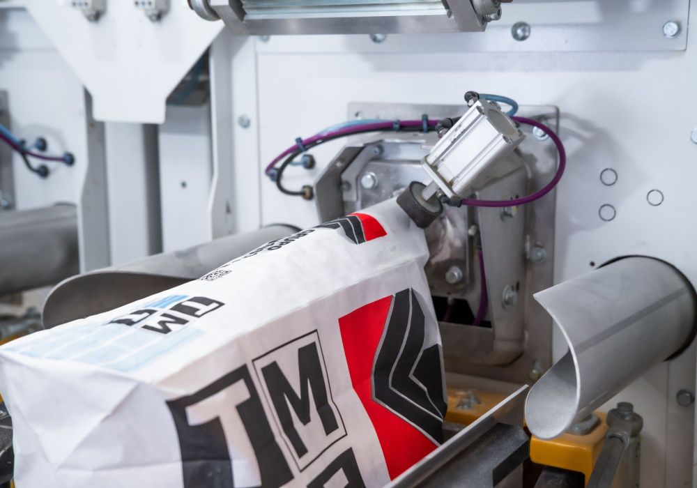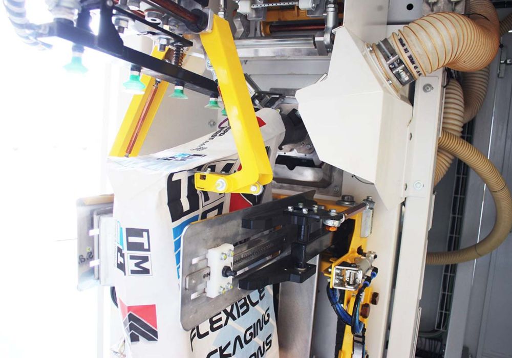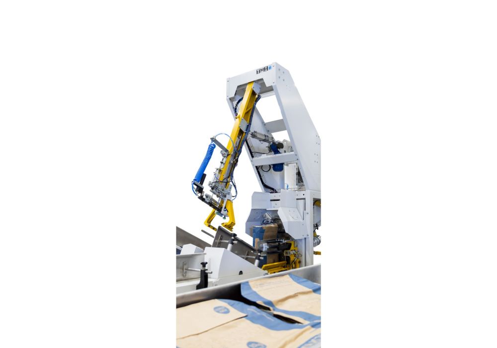 Vollautomatische Absackung mit tangentialem Sackplatzierungssystem und automatischer Ventilöffnung am Platzierungsarm